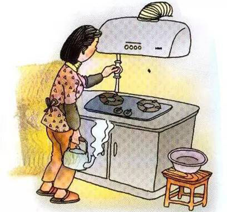 3、使用燃气莫离人,用后切记关阀门。使用燃气时要有人照看,避免汤水沸溢后熄火焰使燃气泄漏引发火灾、爆炸事故。使用后、临睡前、外出时要关闭燃气阀门。