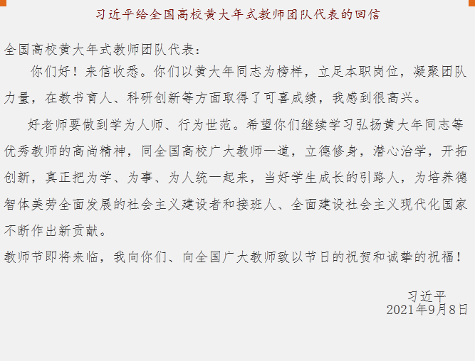 在第三十七个教师节来临之际,中共中央总书记、国家主席、中央军委主席习近平9月8日给全国高校黄大年式教师团队代表回信,对他们寄予殷切期望,并向全国广大教师致以节日的祝贺和诚挚的祝福。