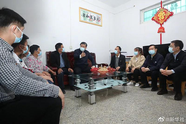 5月14日上午,中共中央总书记、国家主席、中央军委主席习近平在河南省南阳市主持召开推进南水北调后续工程高质量发展座谈会并发表重要讲话。这是座谈会前,习近平于13日在南阳市淅川县九重镇邹庄村,同移民户邹新曾一家三代围坐在一起聊家常。新华社记者 王晔 摄