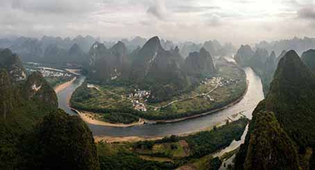 这是2018年10月18日拍摄的广西桂林阳朔县兴坪镇的漓江景色(无人机拼接照片)。新华社记者 李鑫 摄