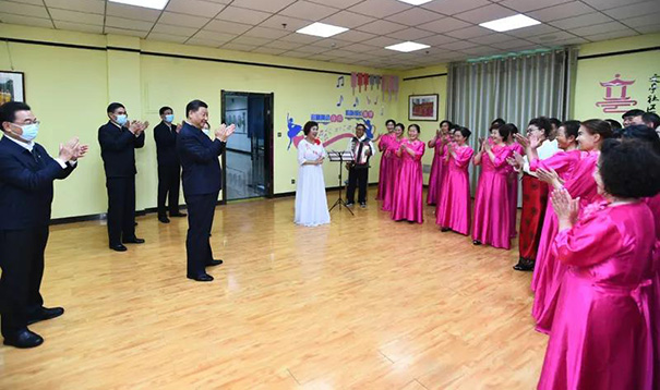 6月7日至9日,中共中央总书记、国家主席、中央军委主席习近平在青海考察。这是7日下午,习近平在西宁市城西区文汇路街道文亭巷社区舞蹈室,观看退休人员歌曲排练。新华社记者 谢环驰 摄