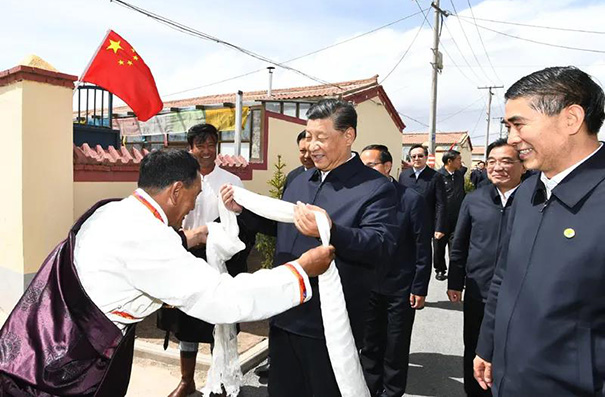 6月7日至9日,中共中央总书记、国家主席、中央军委主席习近平在青海考察。这是8日下午,习近平在海北藏族自治州刚察县沙柳河镇果洛藏贡麻村考察时,藏族牧民索南才让向习近平献上哈达。新华社记者 谢环驰 摄