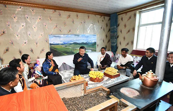 沙柳河镇果洛藏贡麻村是牧民集中安置新村,2017年依托牛羊养殖业等产业实现整村脱贫。习近平来到这里,藏族牧民索南才让率一家老小热情邀请总书记到家里做客,并献上哈达。习近平走进家中,屋里屋外仔细察看,并同一家人围坐在客厅聊家常。索南才让激动地说,牧民生活好,全靠党的政策好,衷心感谢共产党,衷心感谢总书记。习近平指出,今年是中国共产党成立一百周年,我们党发展壮大起来不容易,夺取政权不容易,建设新中国不容易。老百姓衷心拥护中国共产党,就是因为中国共产党始终全心全意为人民服务、为各民族谋幸福。