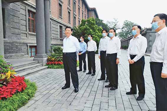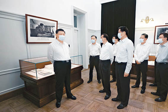 2021年6月25日,中共中央政治局就用好红色资源、赓续红色血脉举行第三十一次集体学习。这次集体学习采取参观和讨论相结合的形式,这是习近平、李克强、栗战书、汪洋、王沪宁、赵乐际、韩正等在北大红楼参观“光辉伟业 红色序章——北大红楼与中国共产党早期北京革命活动主题展”。新华社记者 谢环驰/摄