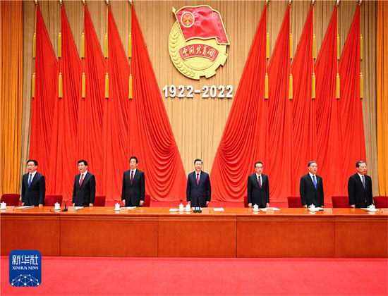 人民大会堂二层宴会厅气氛隆重热烈。主席台上方悬挂着“庆祝中国共产主义青年团成立100周年大会”会标,后幕正中悬挂团徽,团徽下方是“1922-2022”字标,10面红旗分列两侧。